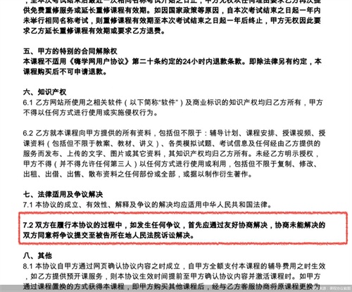 此外,在维权过程中,李雪晴在嗨学网出示的课程协议中还发现一处为消费者设置的维权障碍:在“第七条 法律适用及争议解决”中,明确提出“双方在履行本协议的过程中,如发生任何争议,首先应通过友好协商解决,协商未能解决的双方同意将争议提交至被告所在地人民法院诉讼解决”。