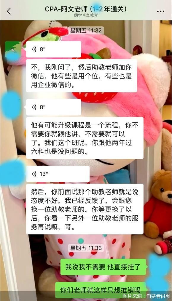 对此,李雪晴的班主任阿文老师(企微昵称为“CPA—阿文老师(1—2年通关)@嗨学卓奥教育”)向她这样解释:“我刚问了,助教老师加你微信,有些是用个人微信,有些也是用企业微信的。”对于助教老师疑似使用虚拟号码的情况,阿文老师并没有回复。