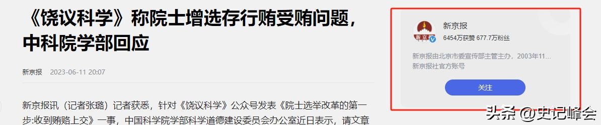 2023-06-11——新京报——首都医科大学校长饶毅发文称院士增选中有行贿受贿,中国科学院相关部门回应