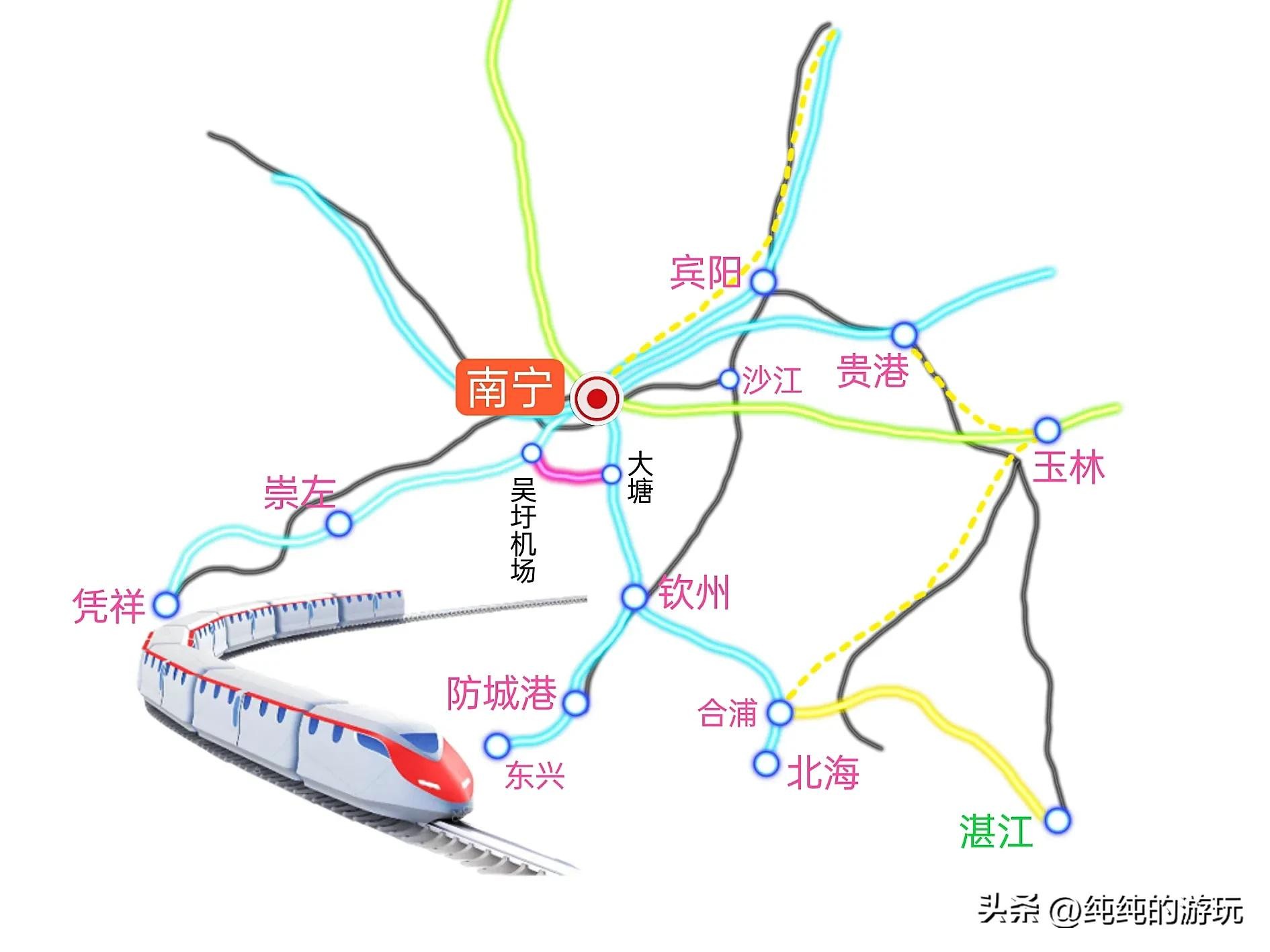 线路长约49公里,为东西走向,计划由良庆区南钦高铁大塘站引出,途经大元站,至大王滩水库,再由明阳工业区西南侧经过,直至和新建的南崇高铁衔接,引入吴圩机场为止。这也是一条高铁连接线路,东连南钦高铁,西接入南崇高铁,对南宁一体化发展具有重要的意义和作用。(规划中的线路)