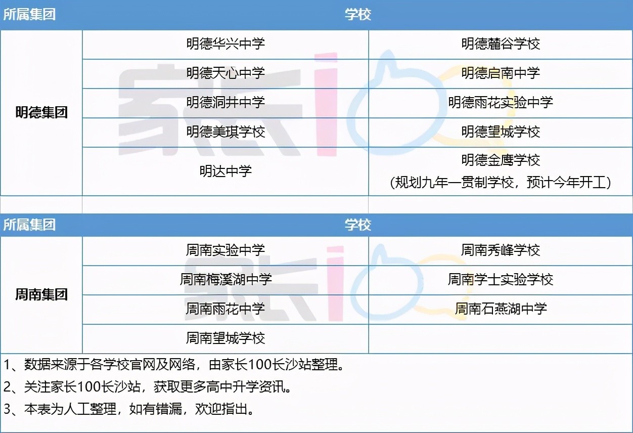 明德中学旗下目前有10所学校(含规划和建设),周南中学旗下目前有7所。