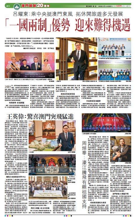 作为澳门奇迹的见证者与亲历者,他感恩国家对澳门发展的支持,令这个仅有30平方公里的小小城市能有今日之成绩─经济腾飞、民生改善、居民安居乐业;而澳门回归的历史机遇,也让他有了成就自己一番事业的可能。