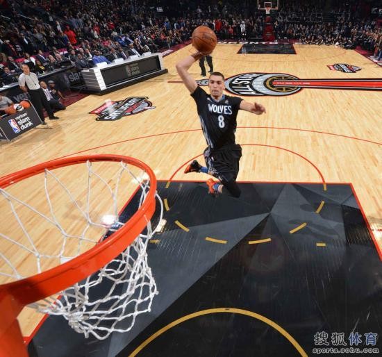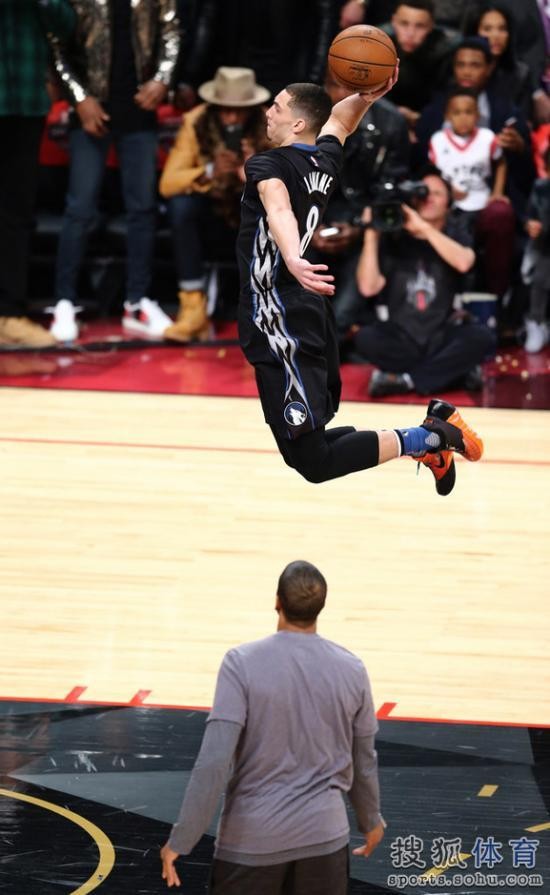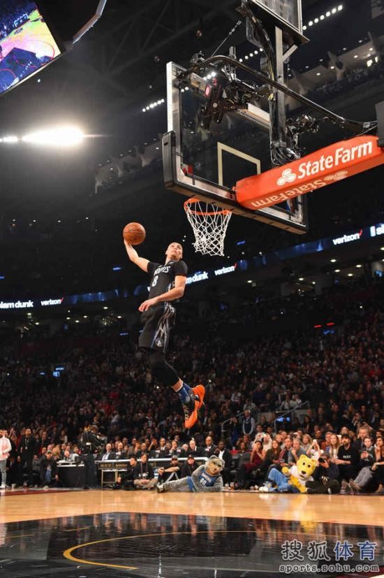拉文在决赛中的第一扣和戈登差不多,只不过他是自己抛球之后,借着球在地板上的反弹,直接在空中直接跃起之后拿到球,一个360度的转身战斧式劈扣。