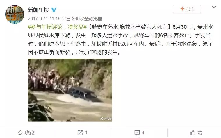 “重庆到利川避暑的自驾车不幸坠河。先车在小河沟陷得不深,有人建议车上人先下来,再用绳子牵上车,但车上人不采纳。从找绳子到喊人过了相当一段时间,完全可以从车窗往外转移车内人。因当时的水只淹没腿部,完全可以救出车内所有乘客。由于车上傻子太多人固执,导致错过救人关键时机,车慢慢移向深水中…车上的人在万分危急,死到临头的时候,不是当机立断开车门自救脱险,而是仍然抱着大爷心态,端坐车内,期待有人拉他上岸,悲剧就此发生。 ”并附上一段众人在小河边齐力拉车的视频。