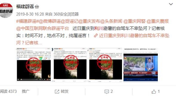 2019年8月30日,福建辟谣就曾发布文章《近日重庆到利川避暑的自驾车不幸坠河?记者核实:时间不对,地点不对,纯属谣言!》对网传消息进行辟谣。