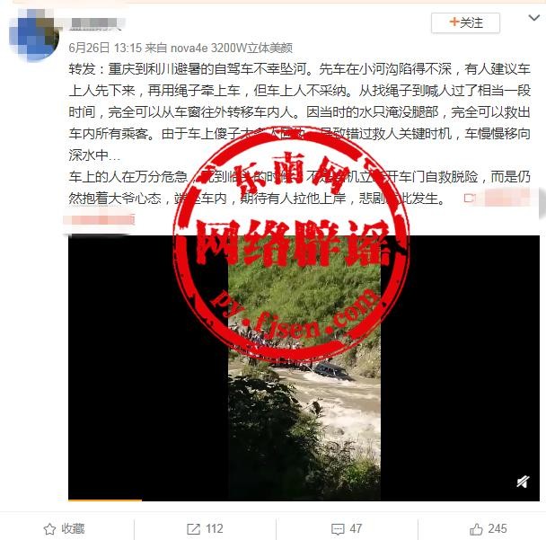 可见网传“重庆雨水太大,一车人全部被洪水冲走”、“重庆到利川避暑的自驾车不幸坠河”、“由于车上傻子太多人固执,导致错过救人关键时机”全部都不符事实!