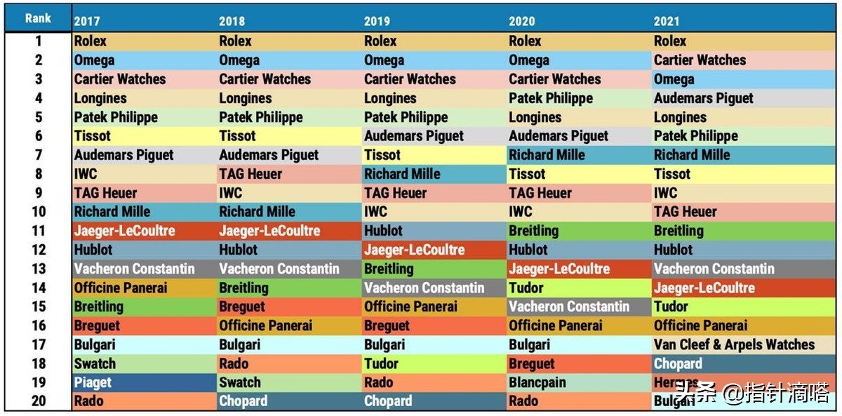 在2021年中,最令人惊讶的位置变化之一,是百达翡丽从第四位下降到第六位(销售收入),然而,当然值得注意的是,百达翡丽的市场份额从2020年的4.8%提高到2021年的5.8%。