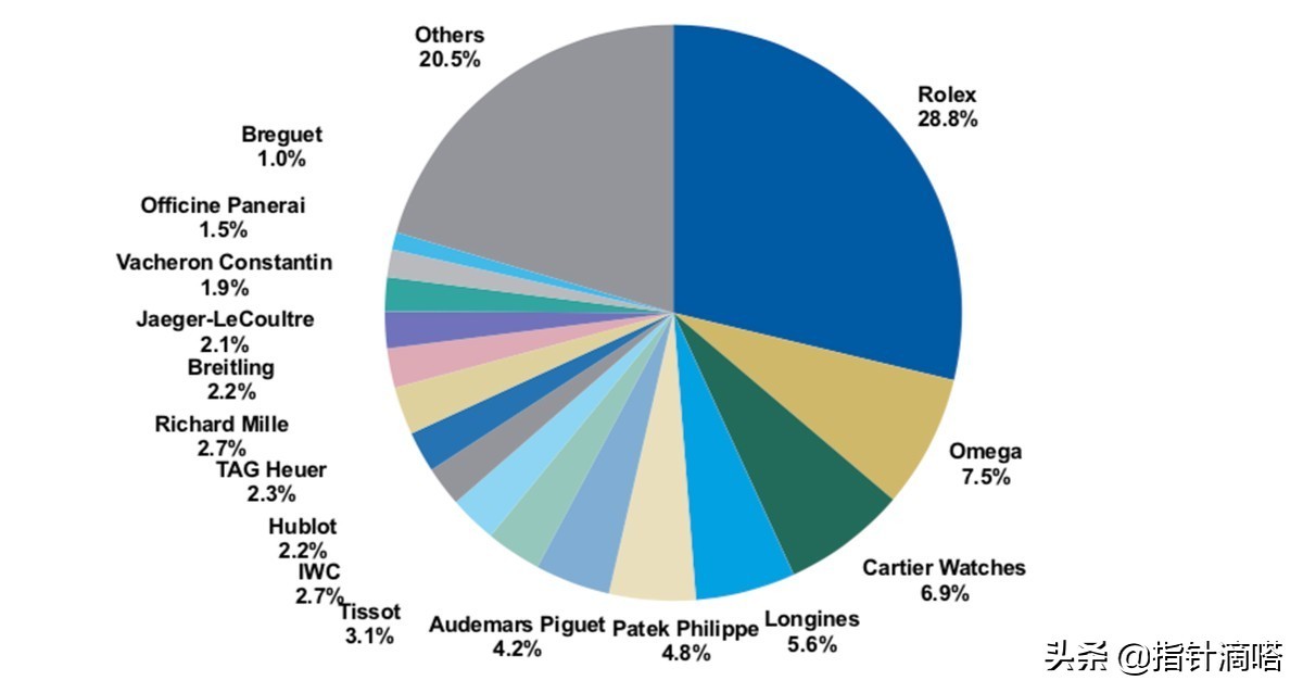 劳力士(28.8%的份额)欧米茄(7.5%的份额)卡地亚(6.9%的份额)