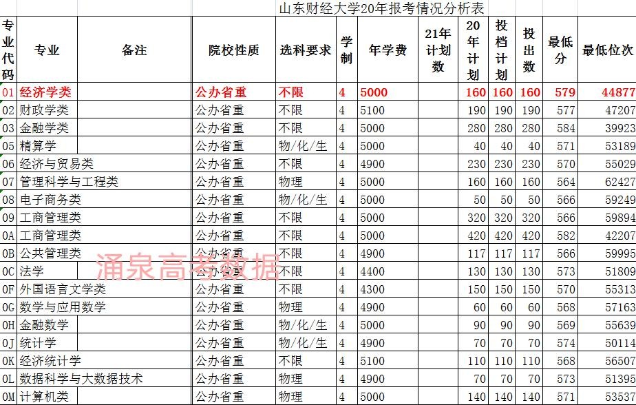 性质:公办。省重隶属:山东省教育厅校区:在济南有燕山、舜耕、圣井、明水四个校区。专业设置:国家级特色专业7个:财政学,会计学,国际经济学与贸易,信息管理与信息系统,工商管理,经济学,金融学招生概况及分析:20年山东普通类招生计划2787人,专业录取最低分567分(58547位)计算机类至584分(39923位)财政学,分数差17分,位次差18624位。校企合作计算机科学与技术(与惠科合作)527分(117752位)