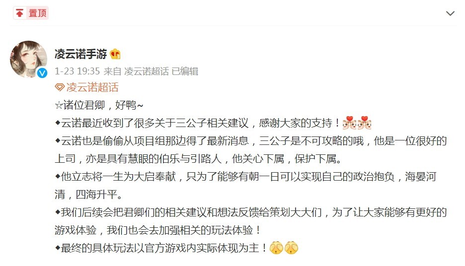 面对越来越多玩家的质疑,官方也是急忙推出公告,称三公子是不可攻略的角色,从人设上他只是一位很好的上司,对女主仅是关心下属、保护下属的原则。