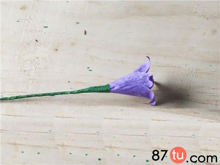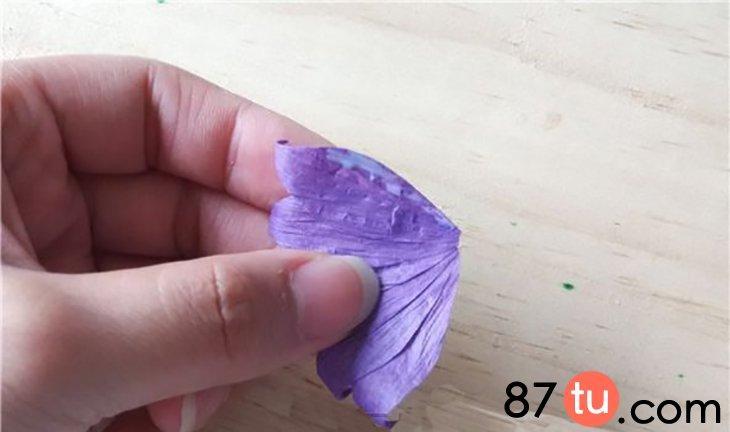 再最后一片花瓣的边缘出抹上胶水,与第一片花瓣围拢起来,第一片花瓣要粘在第6片花瓣上面,使整个花朵都是一片压着另一片的形状,花朵的底端不要粘的太死,要留些空隙,后面要放有花蕊的铁丝,空隙也不要太大,太大的话,花蕊跟花朵用绿胶带固定不住。