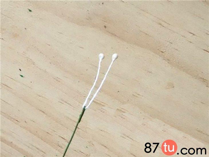 将花蕊对折,用铁丝钩住,用钳子将弯下来的铁丝夹紧,然后用绿胶带在花蕊下方缠一下,更好的将花蕊固定在铁丝上。