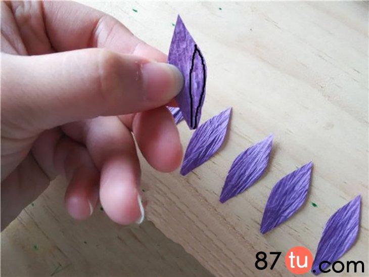 再将花瓣粘成一个圈之前,先用剪刀将花瓣顶端部分刮弯,这样方便些,几片可以一起刮,速度快,效果也好。如果是先粘成一个圈,再刮花瓣,这样不好操作,还得一片一片的刮,花时间。