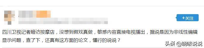 有网友说道:四川卫视记者暗访按摩店,没想到假戏真做,敏感内容直接电视播出,据说是因为非线性编辑显示问题,在视频中看的不清楚,但是到了电视上特别的清晰。查了下,还真有这方面的论文,懂行的说说?