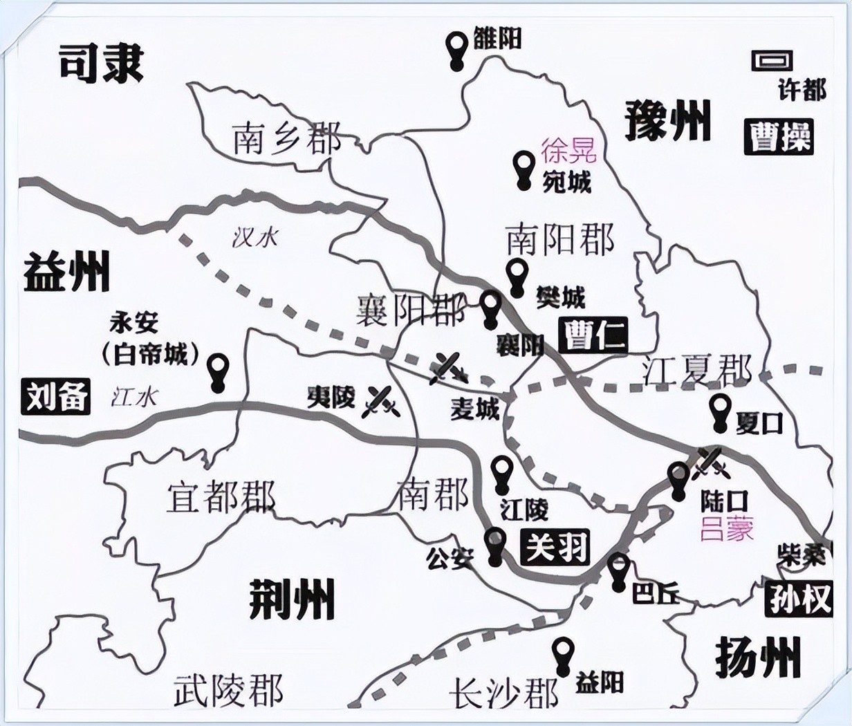 后来,在“孙刘联合抗曹”的战略背景下,刘备依次用江夏郡北部,和长沙、桂阳两郡换取了南郡。南郡是抵抗曹魏的最前线,也是实施诸葛亮的“隆中对”战略,实现北伐,统一全国的关键地带,刘备派遣亲信大将关羽镇守此地。