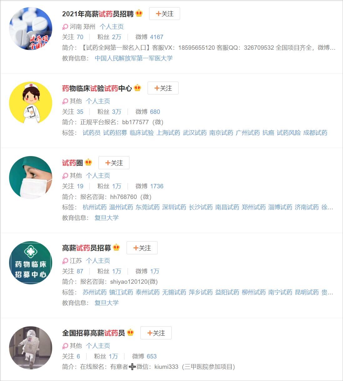 在微博搜索“试药”,会发现不少相关博主的粉丝都已经上万,在他们发布的试药招聘信息中,不仅免费提供吃住,而且短期内报酬丰厚,只需要服用一两片的药物,四五天,就有三五千甚至上万元的报酬。