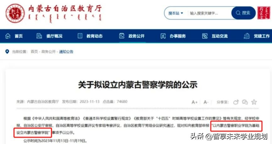 2023年11月13日,内蒙古自治区教育厅发布《关于拟设立内蒙古警察学院的公示》对拟向教育部申报“以内蒙古警察职业学院为基础设立内蒙古警察学院”予以公示。