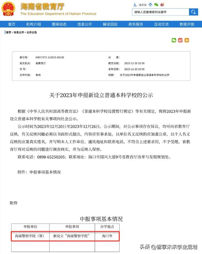 2023年12月20日,海南省教育厅发布《关于2023年申报新设立普通本科学校的公示》,拟申报设立“海南警察学院”,办学地点在海口市。