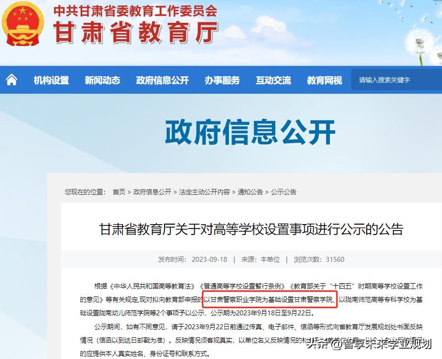 2023年9月18日,甘肃省教育厅发布公告,对以甘肃警察职业学院为基础设置甘肃警察学院进行公示。据悉,甘肃警察职业学院升格为甘肃警察学院后,拟定招生规模为6500人。