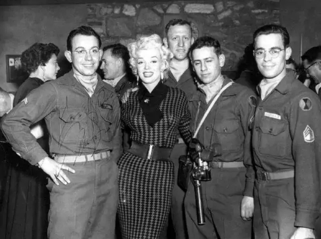 一、1954年2月16日好莱坞性感女性玛丽莲·梦露去驻朝鲜半岛的美军进行慰问演出,图为和官兵合照。