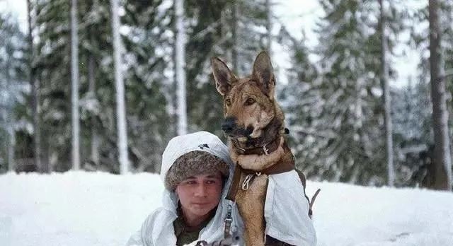 二十一、图为隐藏在雪地里的芬兰士兵和他的猎犬。彩色版。