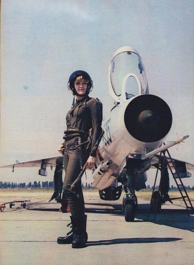 十四、1968年的南斯拉夫环球小姐达利博卡·斯托伊西奇穿着飞行服依靠在米格f21战斗机旁合照。机帅人美。