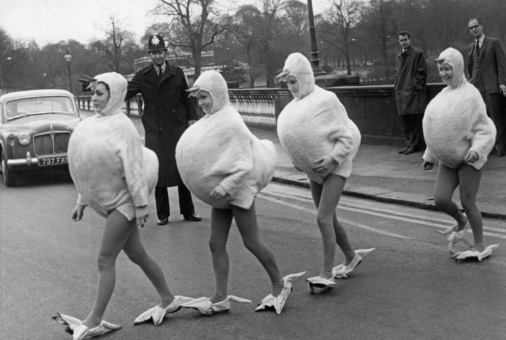 二十九、在英国伦敦海德公园,四位女士正在扮演鸭子过马路!