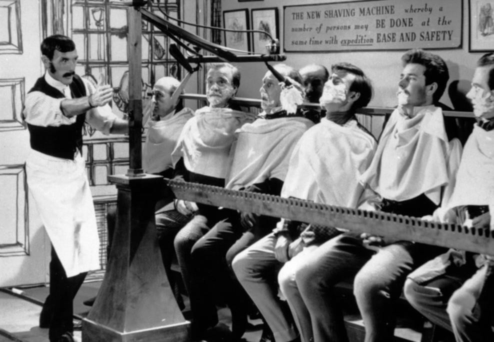 二十七、1960年英国喜剧演员埃里克·赛克斯在一部电影中操作大型刮胡机,不说刮胡机的话,我还以为是铡刀呢。