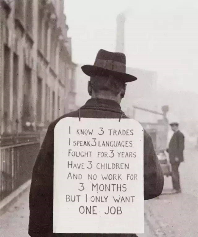 二十五、上个世纪金融大危机的情况下,打工人们不得不推销自己,上面写着我会三种语言,有三年工作经验,三个孩子,失业三个月了,我需要一份工作。