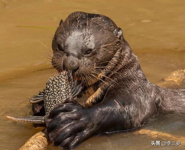 17、雨林中的巨獭正在享用它的食物——清道夫,它龇牙咧嘴,吃得是津津有味。