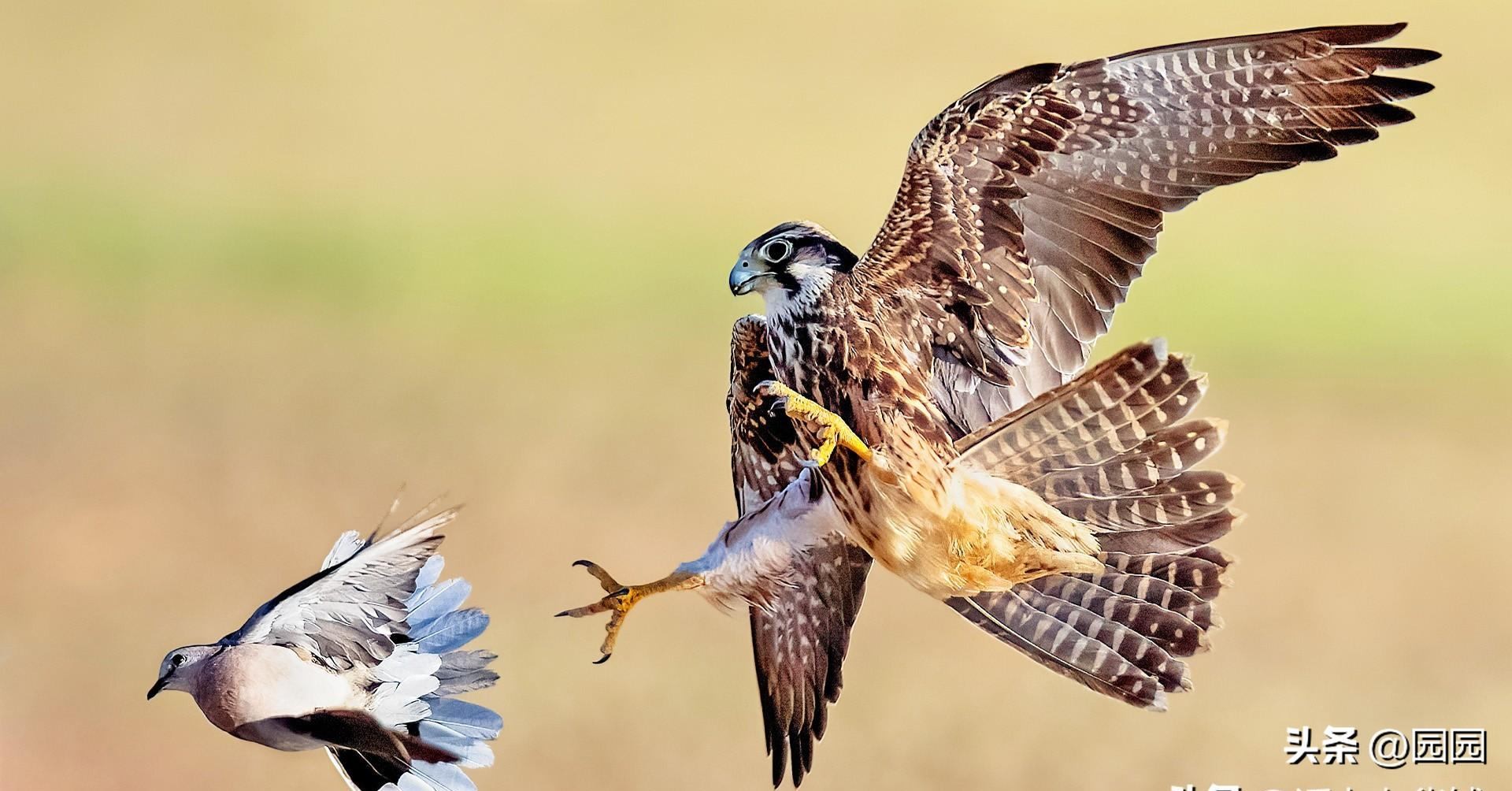 38、一只兰纳隼从高空俯冲而下,锁定了一只鸽子作为猎物。