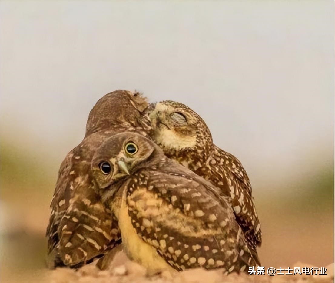 37、三只小猫头鹰聚在一起咬耳朵,其中一只比较聪慧的小猫头鹰把头一歪,突然发现偷拍它们的摄像机。