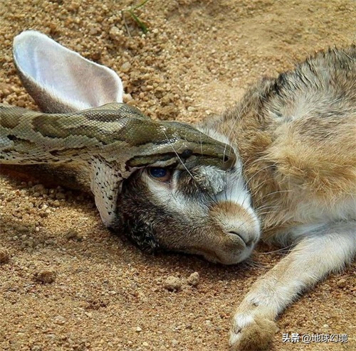 14、兔子已经奄奄一息,接下去它就等着看上去比自己脑袋更小的蟒蛇一点一点吞掉它的身体。
