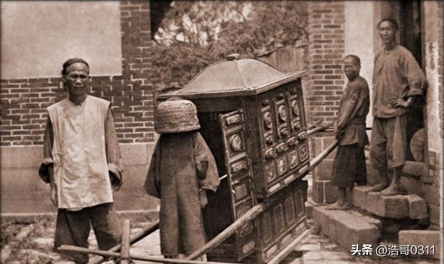 21、晚清福建女子出嫁。轿夫在一旁等候,新娘带个箩筐独自下轿