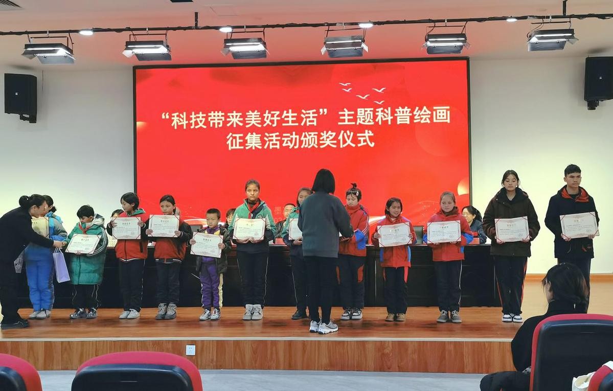 (“科技带来美好生活”主题科普绘画征集活动为获奖的学生们颁奖 朱歆柯穆 摄)
