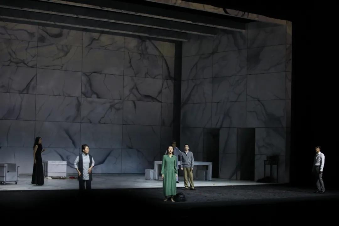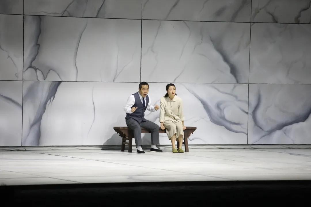 央华版《雷雨》,由法国导演埃里克·拉卡斯卡德执导,这是国内首次由外国导演执导并改编经典作品。埃里克导演在尊重曹禺先生原著作品的基础上,对舞台表现进行大胆创新,现代化风格的舞美不同于往前的话剧版本,舍弃了例如屏风、灯盏、扶梯等过多的装饰,仅留下了几张与周公馆大理石墙背景相一致的桌椅和一张传统中国风木质长凳。这样使得在有限的舞台空间中,营造出一种空旷之感。通体纯白的大理石墙作为周公馆的内景从天而降,似是这封建权威的不可侵犯。而白墙上浮动着的黑色纹路像是这看似平静的周家涌动着的暗流,一触即发。