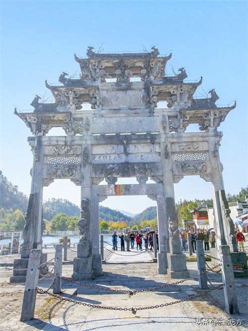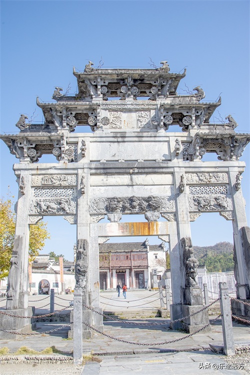 走进西递古村落,首先映入眼帘的是一座高大的牌楼——胡文光刺史牌楼。这座牌楼是明朝万历六年(1578年)朝廷为表彰胡文光为官二十三年的政绩而修建的。牌楼高12.3米,宽9.96米,三间四柱五楼,通体用质地细腻的“黟县青”砌成,雕琢精绝,巍峨高耸,是中国石筑牌坊之瑰宝。