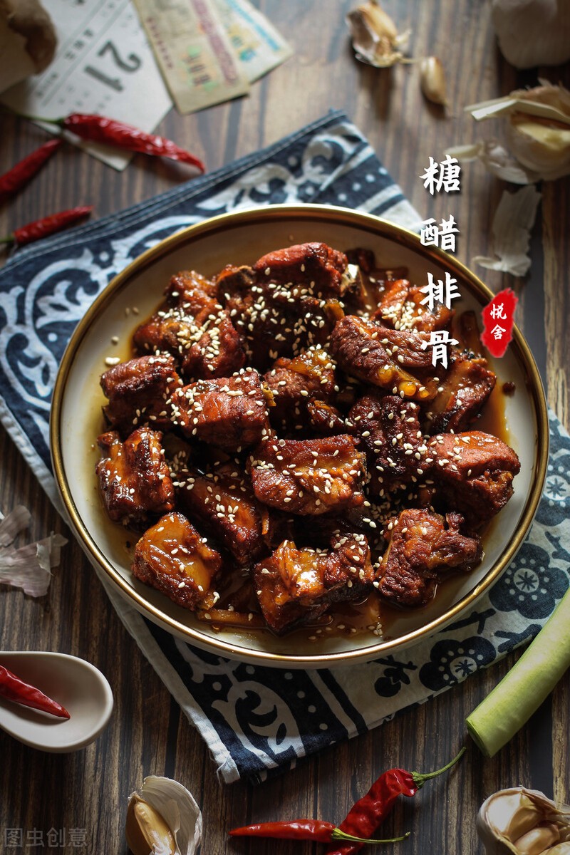 正宗的糖醋排骨做法和用料都颇为讲究,一般排骨选用仔排、肋排。排骨需先去除血水,沥干腌制入味,然后裹上粉下油炸至表面金黄酥脆捞出备用,冰糖炒出糖色后放排骨入锅翻炒,最后淋上米醋调成糖醋味。这里一定要用米醋,陈醋味道太重影响口感。