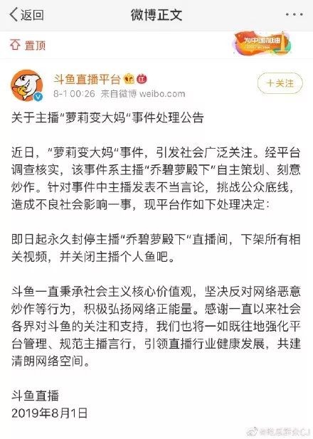 8月1日凌晨,斗鱼官微发布处理公告称: