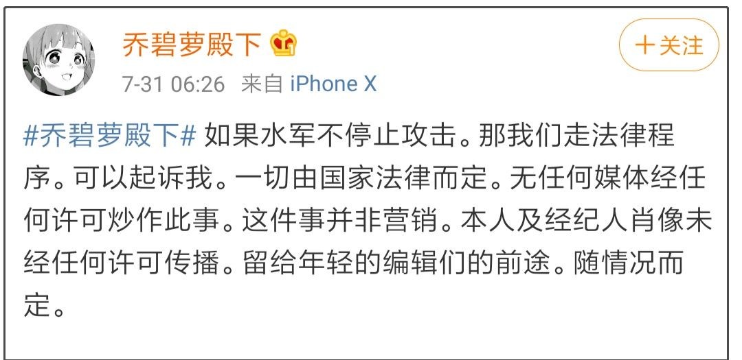 7月31日,“乔碧萝殿下”发微博称:这件事并非营销。