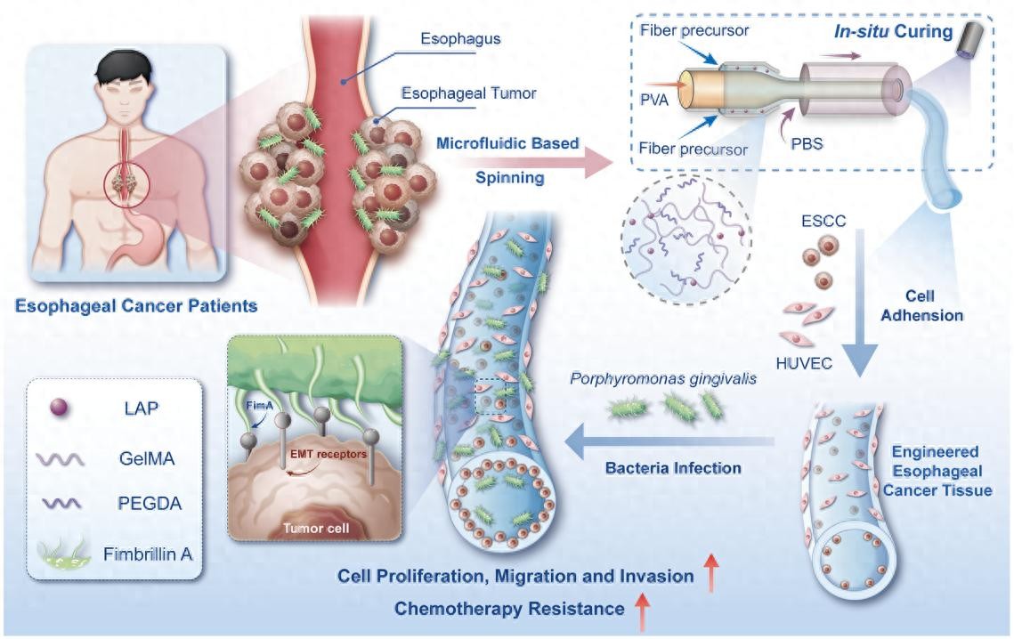本次研究就是通过医、理、工多学科交叉融合,将细胞自组装和微纤维生物复合凝胶相结合,通过对微流控芯片多层同轴流体的精细操控,在全球首次构建高度还原患者病理微环境的食管癌仿生器官模型。