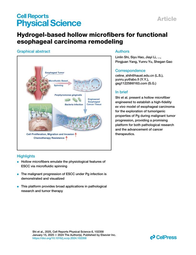 近日,河南科技大学第一附属医院高社干教授及其团队在国际权威期刊细胞子刊《细胞报告物质科学(Cell Reports Physical Science)》(中国科学院综合性期刊2区)上发表题为《Hydrogel-based hollow microfibers for functional esophageal carcinoma remodeling》(基于水凝胶的中空仿生微纤维用于食管癌功能重塑)的研究论文,并被选为同期封面文章。河南科技大学临床医学院石林林博士为第一作者,高社干教授为通讯作者,河南科技大学第一附属医院为论文第一署名单位,该研究工作得到了国家自然科学基金和河南省卫生健康委省部共建重点项目等的支持。