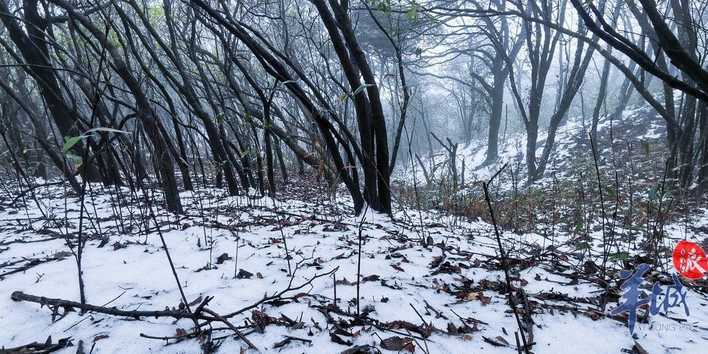 在韶关市始兴县最高峰、海拔1428米的观音栋,可以明显看到地面积雪,山林间白皑皑的一片,让极少见到雪景的当地群众兴奋不已。