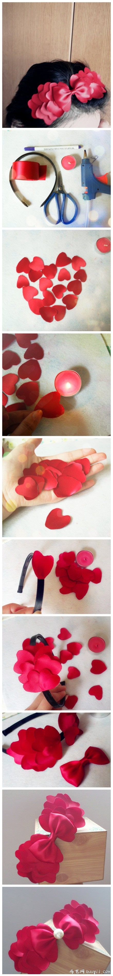 利用绸带来制作,剪出一个个爱心,粘贴到塑料发箍上,再安装上一个蝴蝶结,漂亮发箍就完成了。