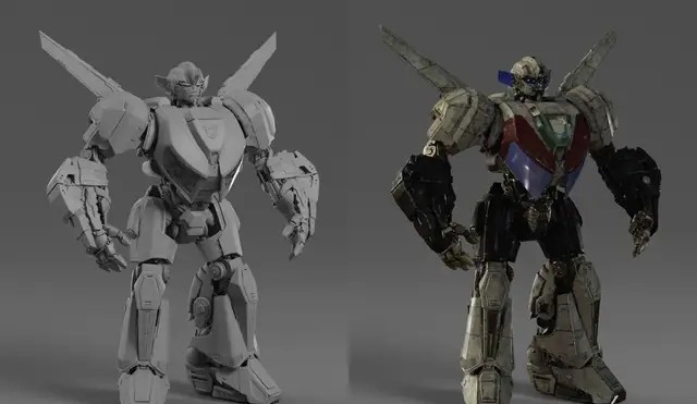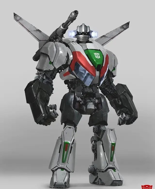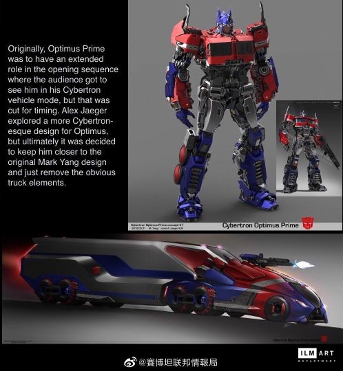 从电影早期设定图看擎天柱人形蓝色部分较多,车型则类似游戏塞伯坦之战中擎天柱的载具形态加上了车厢,到了最终的设定才成为电影中的形象。