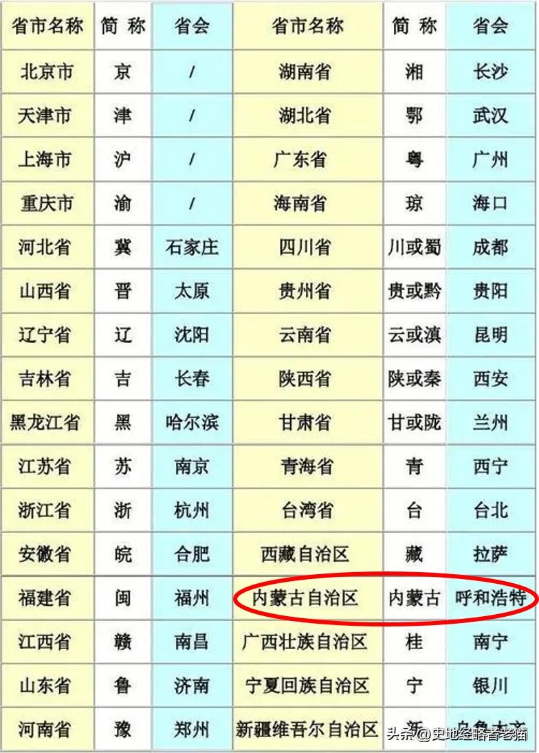 难道老猫三十多年来都记错了,我明明记得内蒙古的汽车牌照首字都是“蒙”。于是我自己查了资料,果然内蒙古自治区的简称果然是“内蒙古”。我把全国三十多个省级行政区的简称给大家放出来,大家自行看一下。是不是内蒙古自治区很特殊,全国只有内蒙古自治区的简称是三个字。