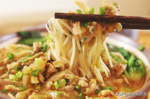 材料: 瘦肉150克、榨菜半个、葱2根、拉面酌量、料酒半大匙、酱油半大匙、湿淀粉半大匙