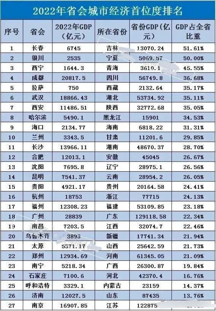 最后,从上榜城市的数量也能看出各省份内部经济发展也是非常不均衡的。就比如大家经常调侃的四川省会成都,以及湖北省会武汉,他们省会城市首位度占全省比重都达到35%,而我们江苏的省会城市南京首位度排名倒数第一,这就导致了各省份城市内部贫富差距可能就越大,省会城市,强地级市对人口的的吸引力越大。出现内部发展极不平衡的状况。