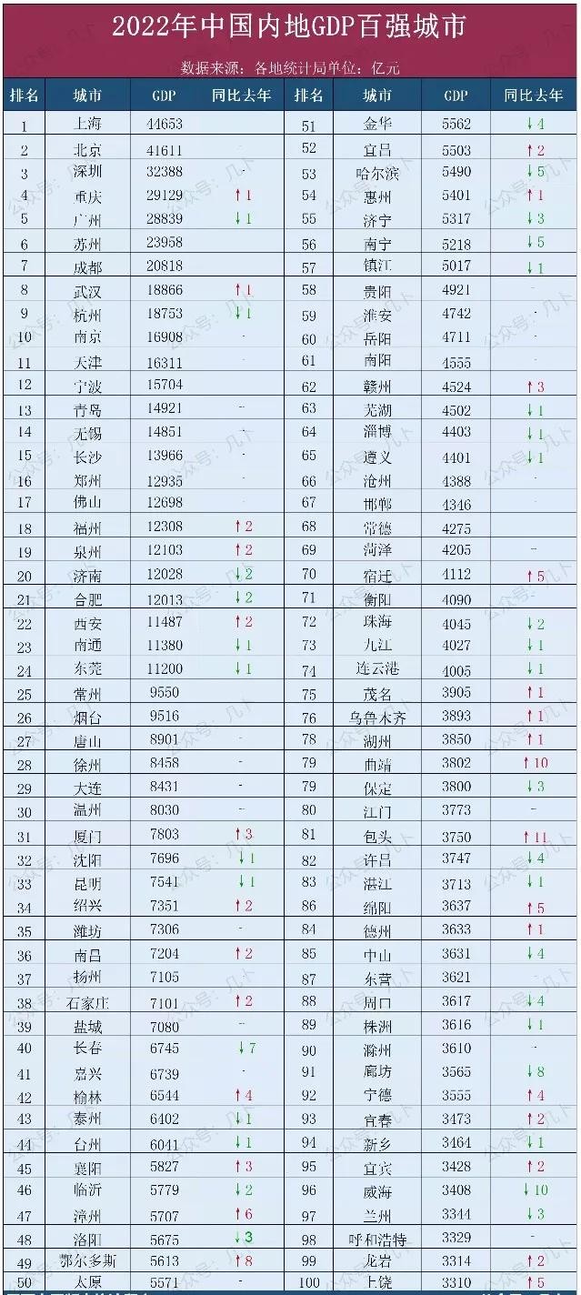 伴随着极不平凡的2022年,根据各地统计局公布的数据信息,百强城市名单新鲜出炉。下图是百强城市名单,通过名单我们会发现各省市经济发展状况。