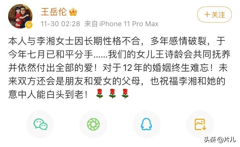 王岳伦宣布与李湘离婚!11月30日凌晨,导演王岳伦在社交平台上突然宣布已经与李湘在今年7月离婚。王岳伦除了强调两个人会共同抚养女儿王诗龄外,更是强调自己对于这段12年的婚姻终生难忘。